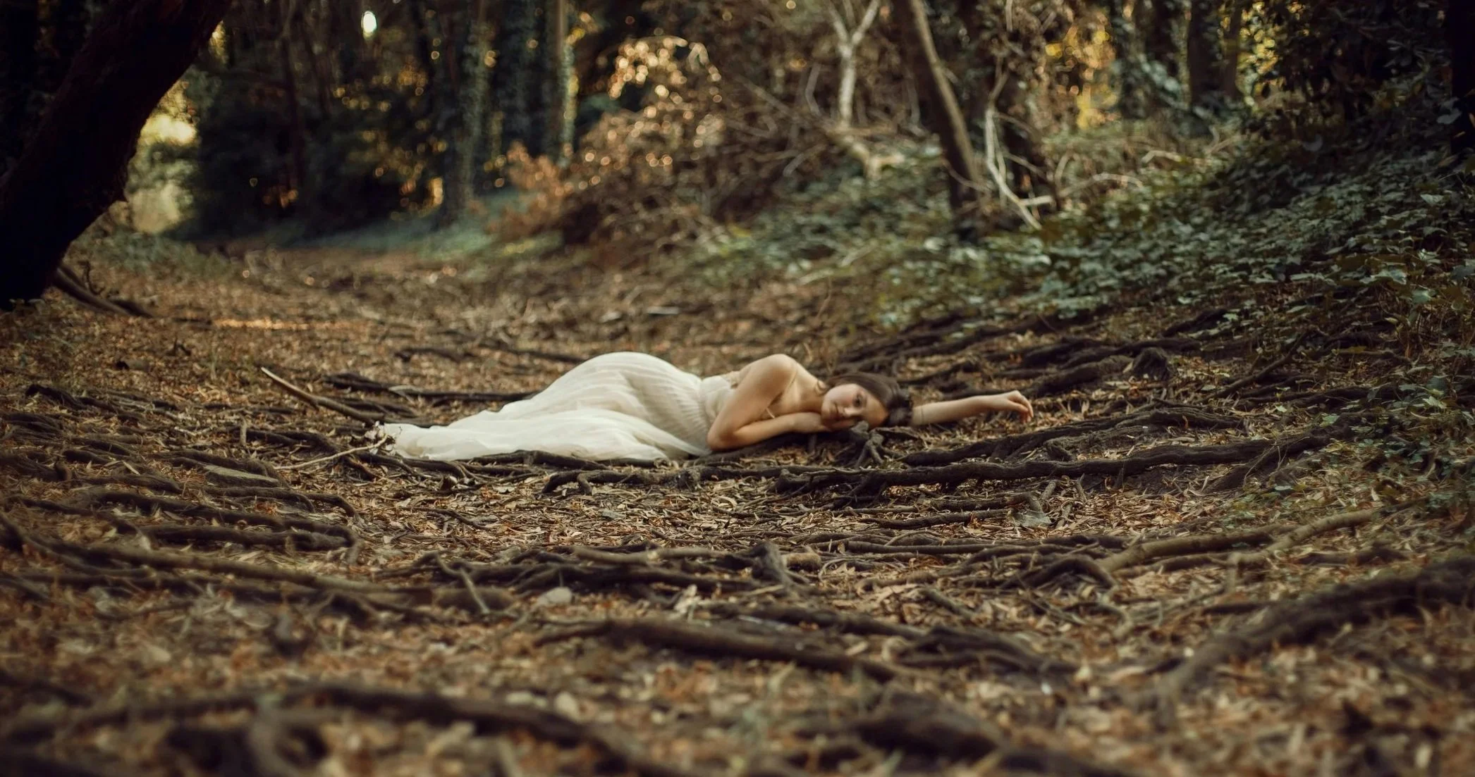 A woman lying on the forest floor among tree roots, wearing a white dress, with her head resting on her arm and looking at the camera.